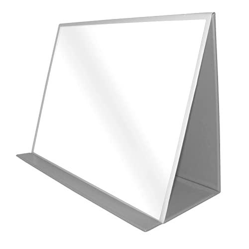 - The 16'' X 12'' Rectangular mirror attaches to a free-standing base that stays in position with hook and loop attachments
